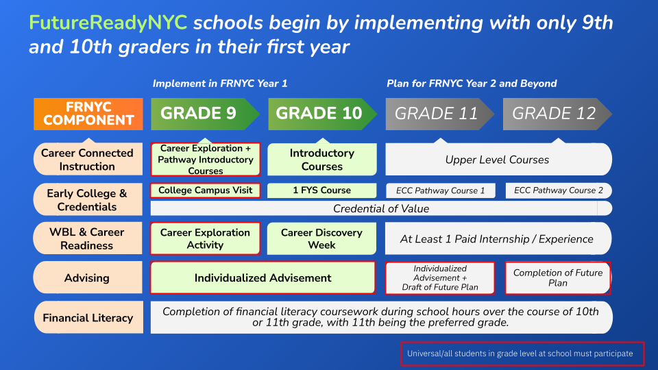 First-year Implementation describes schools launching FRNYC for the first time. For school year 25-26, all Cohort 4 schools will follow First Year Implementation. First Year implementation schools must implement all five FRNYC core components in Fall 2025 covering grades 9-10 only, with the expectation that implementation will expand to all grades in SY26-27.