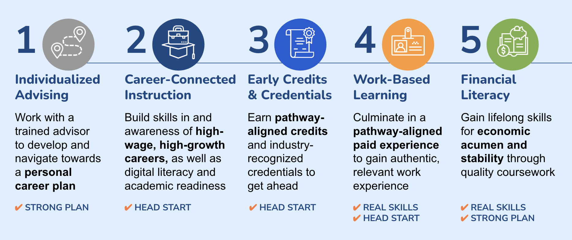 Participating schools receive support, funding, and technical assistance to design and implement labor market-aligned, career-connected pathways that equip students with: